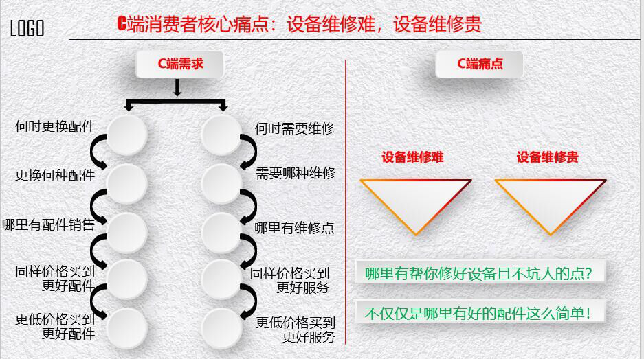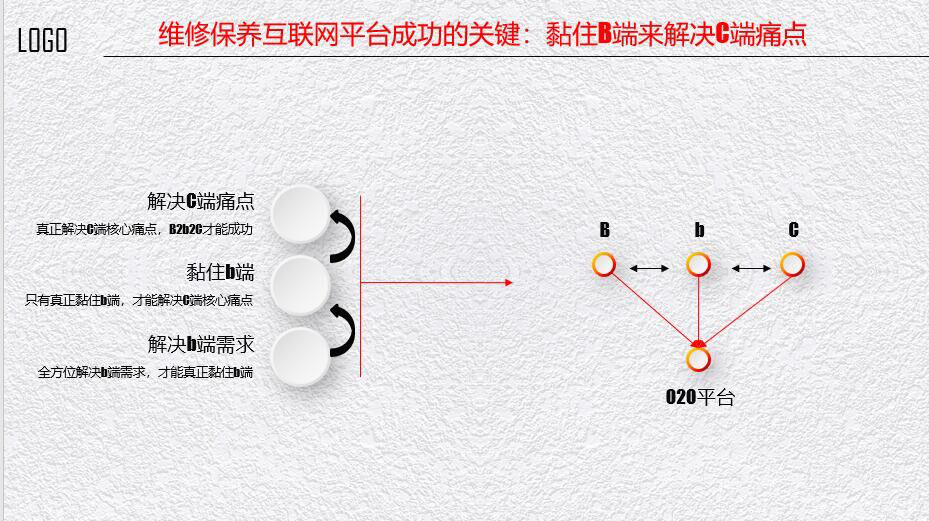 互聯(lián)網(wǎng)平臺(tái)怎樣才能夠有可能成功?就是必須拎住B(中間商)端,來(lái)解決C端的痛點(diǎn),互聯(lián)網(wǎng)平臺(tái)才能真正成功。知道真正的B端,才能解決C端的需求,全方位解決b端的需求,那才是B2B,也就是說(shuō)粘住B端來(lái)解決C端痛點(diǎn)。C端的痛點(diǎn)是什么?第一是配件,第二是維修。每個(gè)維修企業(yè)的毛利率希望往上漲,同時(shí)希望我們的費(fèi)用率越來(lái)越低,將企業(yè)的毛利率和費(fèi)用率進(jìn)行疏導(dǎo),才能更好地獲得收益。