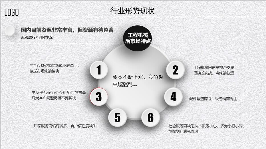 首先是現(xiàn)狀。國(guó)內(nèi)資源非常豐富,我們要將這些資源進(jìn)行整合。1)從二手設(shè)備經(jīng)銷(xiāo)商來(lái)說(shuō),現(xiàn)在的工人和終端客戶的交流相對(duì)較少,缺乏市場(chǎng)終端的機(jī)會(huì),不懂客戶真正的需求。2)工程機(jī)械信息整合交流缺乏實(shí)戰(zhàn),離終端較遠(yuǎn)。3)電商平臺(tái)多為中介和配件經(jīng)銷(xiāo)商,終端客戶問(wèn)題仍得不到解決。4)廠家服務(wù)商詬病多,客戶信任度缺失。5)配件渠道商及二級(jí)經(jīng)銷(xiāo)商為主。6)社會(huì)服務(wù)商缺乏技術(shù)核心,多為小打小鬧,掙錢(qián)了就撤退。